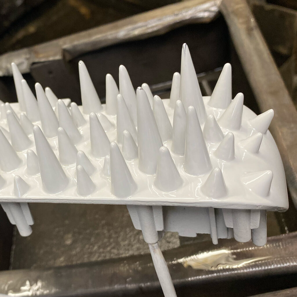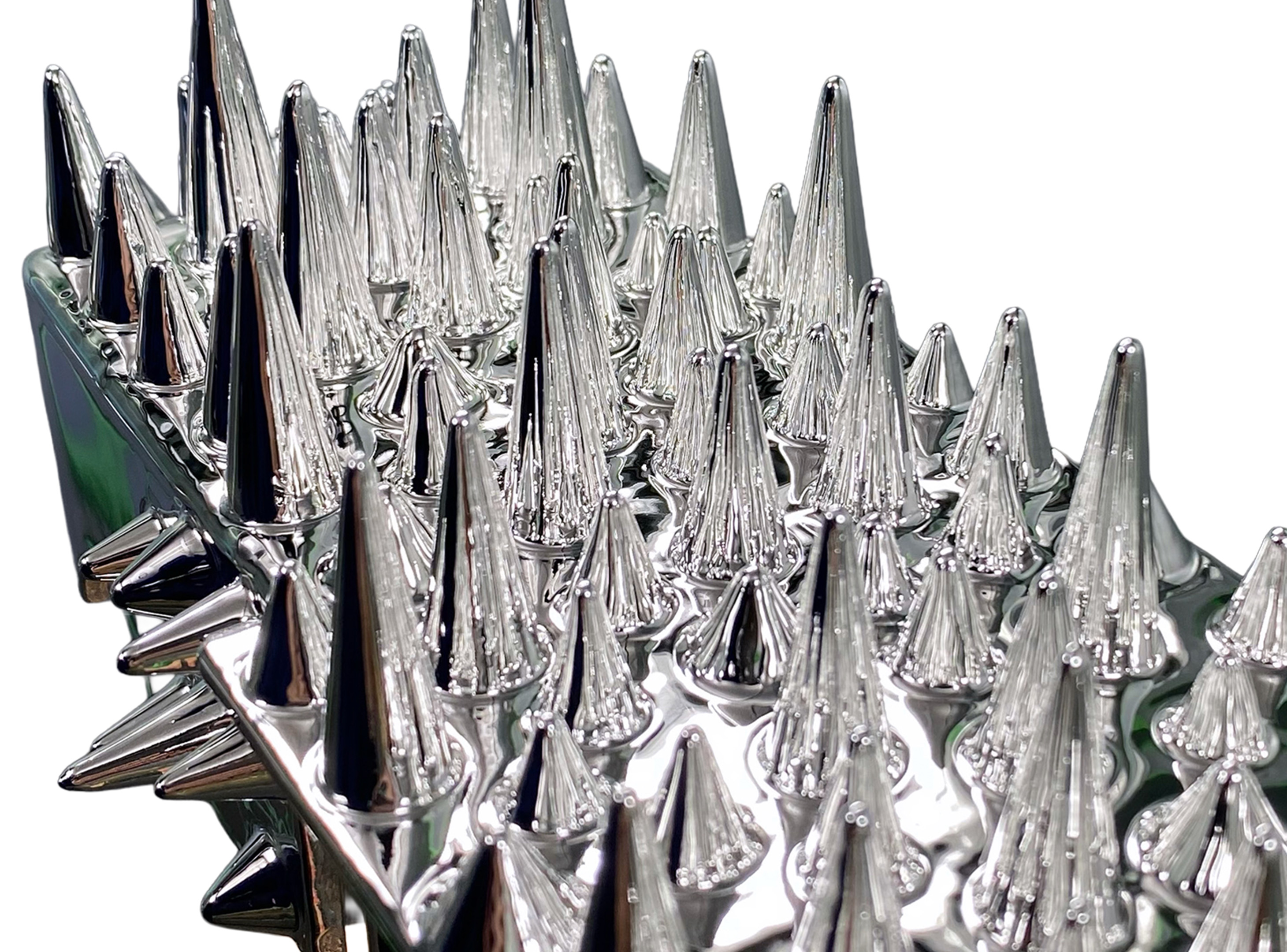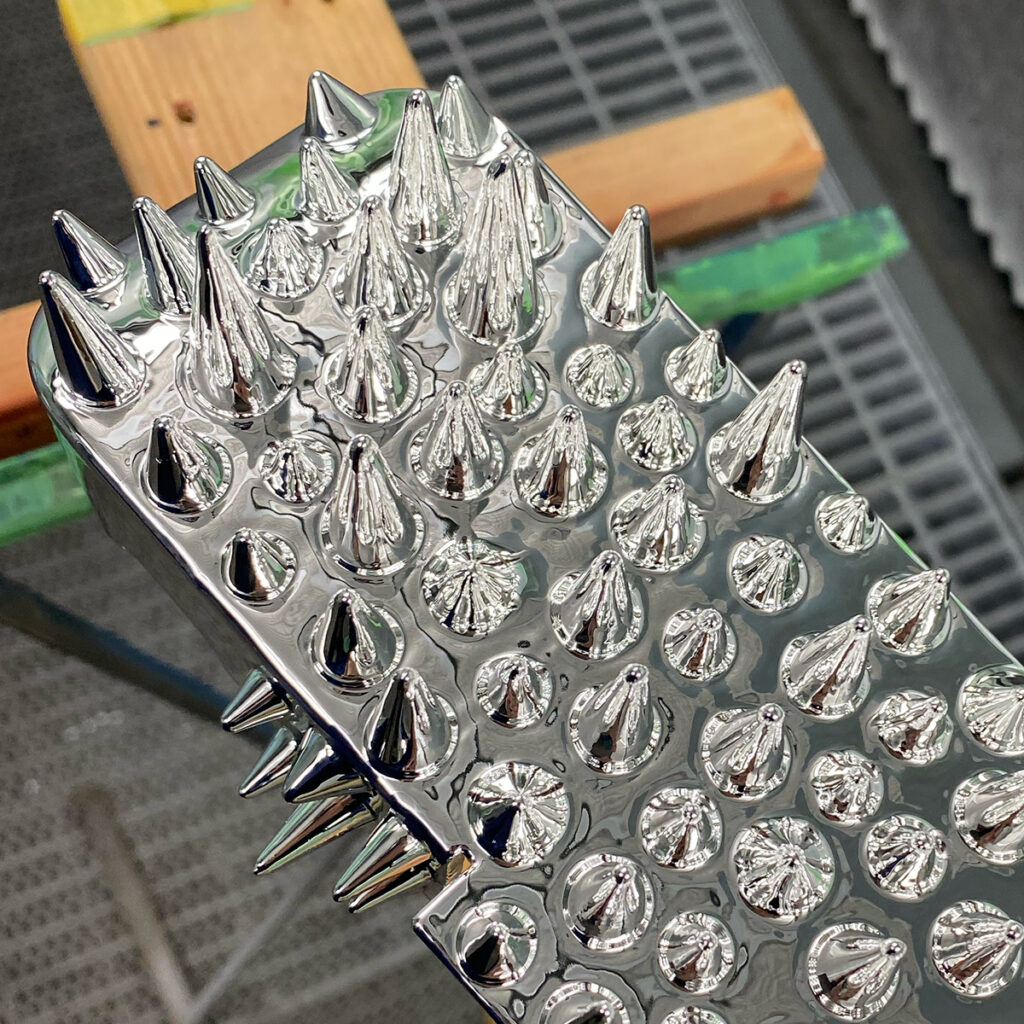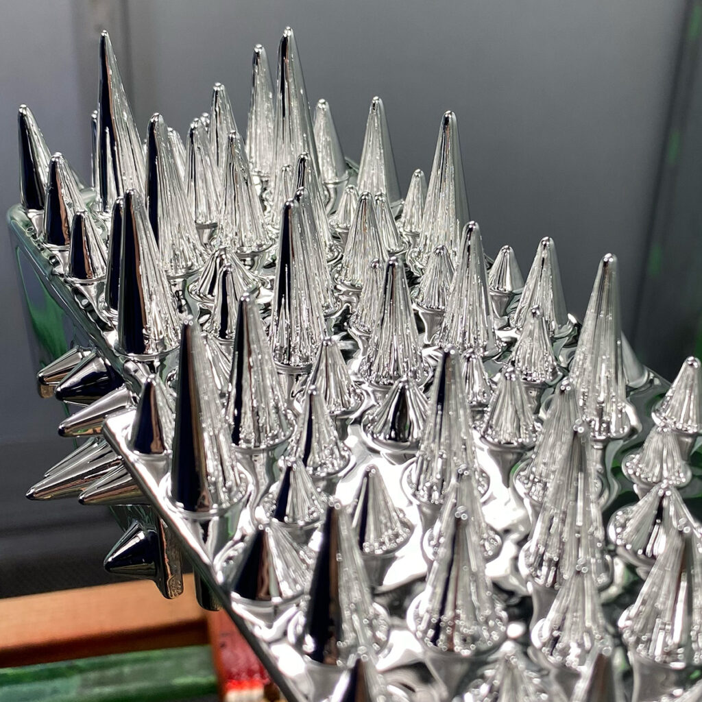 とげ状の複雑なパーツに銀鏡塗装を施工しました。今回の施工で最も大きな山場となったのが、下地づくりのペーパー工程です。鋭く入り組んだ形状のため、一本一本のとげに手作業でペーパーを当てていく作業は、想像以上に時間と集中力を要します。
